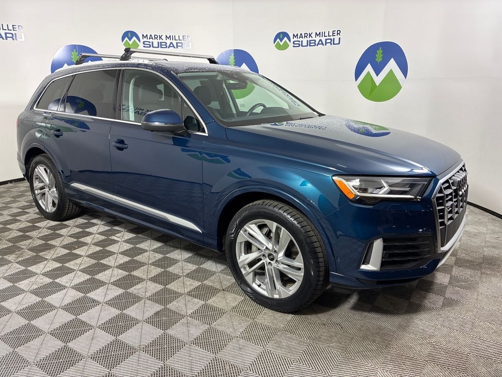 This 2021 Galaxy Blue Metallic Audi Q7 55 Premium Plus AWD is well equipped and includes these features and benefits: 10 Speakers, 3.204 Axle Ratio, 3rd row seats: bench, 4-Wheel Disc Brakes, ABS brakes, Air Conditioning, Alloy wheels, AM/FM radio: SiriusXM, Audi smartphone interface (Apple CarPlay/Android Auto), Auto High-beam Headlights, Auto-dimming Rear-View mirror, Automatic temperature control, Brake assist, Bumpers: body-color, Compass, Delay-off headlights, Driver door bin, Driver vanity mirror, Dual front impact airbags, Dual front side impact airbags, Electronic Stability Control, Emergency communication system: Audi connect CARE, PRIME & PLUS, Exterior Parking Camera Rear, Four wheel independent suspension, Front anti-roll bar, Front Bucket Seats, Front Center Armrest, Front dual zone A/C, Front fog lights, Front reading lights, Fully automatic headlights, Garage door transmitter: HomeLink, Genuine wood door panel insert, Heated door mirrors, Heated Front Bucket Seats, Heated front seats, Illuminated entry, Leather Seating Surfaces, Leather Shift Knob, Leather steering wheel, Low tire pressure warning, Memory seat, Navigation system: Audi MMI Navigation plus with Touch Response, Occupant sensing airbag, Outside temperature display, Overhead airbag, Overhead console, Panic alarm, Passenger door bin, Passenger vanity mirror, Power door mirrors, Power driver seat, Power Liftgate, Power moonroof, Power passenger seat, Power steering, Power windows, Radio data system, Radio: Audi Sound System, Rain sensing wipers, Rear air conditioning, Rear anti-roll bar, Rear fog lights, Rear reading lights, Rear seat center armrest, Rear window defroster, Rear window wiper, Reclining 3rd row seat, Remote keyless entry, Roof rack: rails only, Security system, Speed control, Speed-sensing steering, Split folding rear seat, Spoiler, Steering wheel memory, Steering wheel mounted audio controls, Tachometer, Telescoping steering wheel, Tilt steering wheel, Traction control, Trip computer, Turn signal indicator mirrors, Variably intermittent wipers, and Wheels: 19" 5-Arm-Star Design.