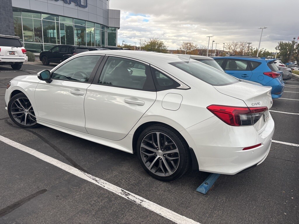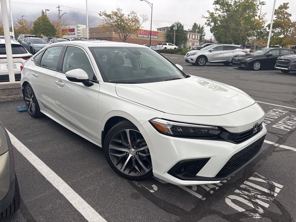 This 2023 White Honda Civic Touring FWD is well equipped and includes these features and benefits: Black w/Leather Seat Trim, 12 Speakers, 4-Wheel Disc Brakes, ABS brakes, Adaptive Cruise Control: Adaptive Cruise Control (ACC) with Low-Speed Follow, Air Conditioning, Alloy wheels, AM/FM radio: SiriusXM, Apple CarPlay/Android Auto, Auto High-beam Headlights, Auto-dimming Rear-View mirror, Automatic temperature control, Blind Spot Information (BSI) System warning, Brake assist, Bumpers: body-color, Compass, Delay-off headlights, Driver door bin, Driver vanity mirror, Dual front impact airbags, Dual front side impact airbags, Electronic Stability Control, Emergency communication system: HondaLink, Exterior Parking Camera Rear, Four wheel independent suspension, Front anti-roll bar, Front Bucket Seats, Front Center Armrest, Front dual zone A/C, Front fog lights, Front reading lights, Fully automatic headlights, Garage door transmitter: HomeLink, Heated door mirrors, Heated Front Bucket Seats, Heated front seats, Illuminated entry, Knee airbag, Leather Seat Trim, Leather Shift Knob, Leather steering wheel, Low tire pressure warning, Navigation system: Honda Satellite-Linked Navigation System, Occupant sensing airbag, Outside temperature display, Overhead airbag, Overhead console, Panic alarm, Passenger door bin, Passenger vanity mirror, Power door mirrors, Power driver seat, Power moonroof, Power passenger seat, Power steering, Power windows, Radio data system, Radio: Bose Premium Audio System w/12 Speakers, Rain sensing wipers, Rear anti-roll bar, Rear seat center armrest, Rear side impact airbag, Rear window defroster, Remote keyless entry, Security system, Speed control, Speed-sensing steering, Split folding rear seat, Steering wheel mounted audio controls, Tachometer, Telescoping steering wheel, Tilt steering wheel, Traction control, Trip computer, Turn signal indicator mirrors, Variably intermittent wipers, and Wheels: 18" Alloy w/Gloss Shark Gray Inserts.