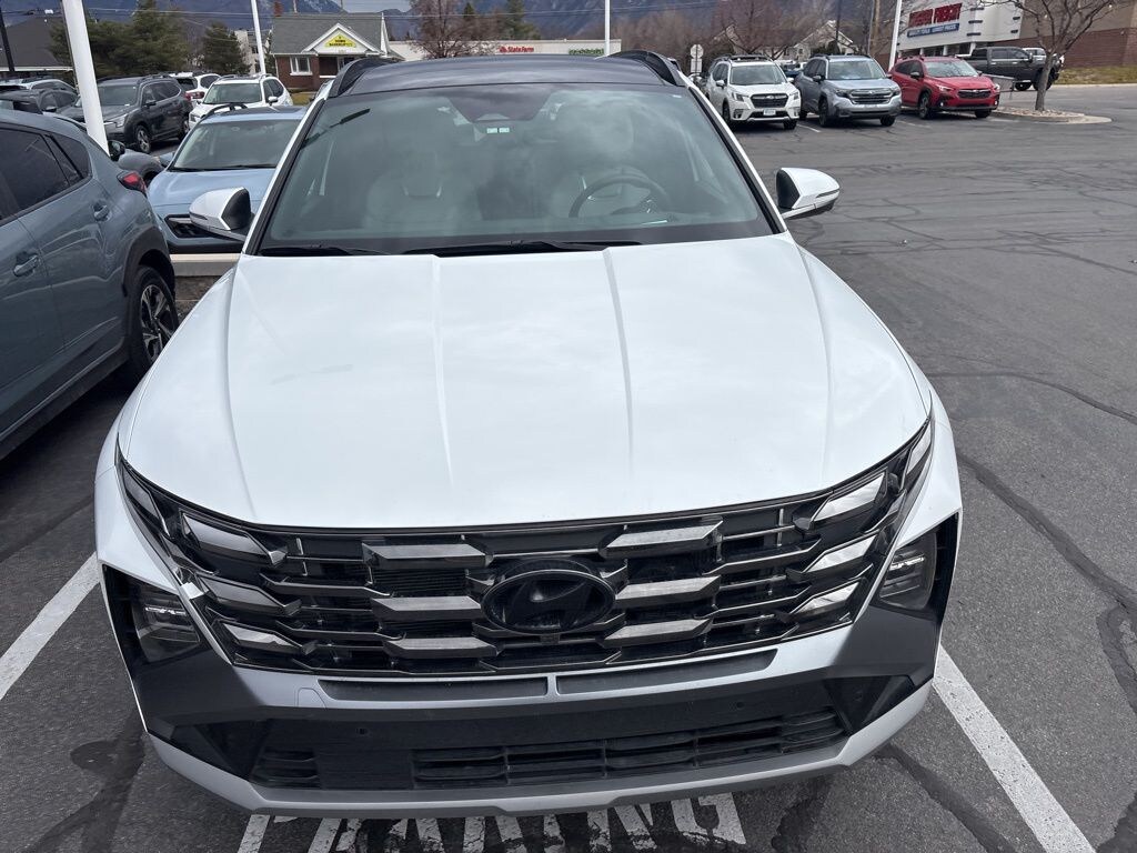 This 2025 Creamy White Pearl Hyundai Tucson Hybrid Limited AWD is well equipped and includes these features and benefits: Option Group 01, 1.6L I4 DGI Hybrid Turbocharged DOHC 16V LEV3-SULEV30, 19" Alloy Wheels, 4-Wheel Disc Brakes, 8 Speakers, ABS brakes, Air Conditioning, Alloy wheels, AM/FM radio: SiriusXM, Apple CarPlay & Android Auto, Auto High-beam Headlights, Auto-dimming Rear-View mirror, Automatic temperature control, Brake assist, Bumpers: body-color, Cargo Net, Cargo Tray, Carpeted Floor Mats, Cross Rails, Delay-off headlights, Driver door bin, Driver vanity mirror, Dual front impact airbags, Dual front side impact airbags, Electronic Stability Control, Emergency communication system: Bluelink+, Four wheel independent suspension, Front anti-roll bar, Front Bucket Seats, Front Center Armrest, Front dual zone A/C, Front reading lights, Fully automatic headlights, Garage door transmitter: HomeLink, Heads-Up Display, Heated & Ventilated Front Bucket Seats, Heated door mirrors, Heated front seats, Heated rear seats, Heated steering wheel, Illuminated entry, Leather steering wheel, Leather-Trimmed Seat Trim, Low tire pressure warning, Memory seat, Navigation System, Occupant sensing airbag, Outside temperature display, Overhead airbag, Overhead console, Panic alarm, Passenger door bin, Passenger vanity mirror, Power door mirrors, Power driver seat, Power Liftgate, Power moonroof, Power passenger seat, Power steering, Power windows, Radio data system, Radio: Bose Premium w/AM/FM/HD Audio System, Rain sensing wipers, Rear anti-roll bar, Rear reading lights, Rear seat center armrest, Rear side impact airbag, Rear window defroster, Rear window wiper, Remote keyless entry, Security system, Speed control, Split folding rear seat, Spoiler, Steering wheel mounted audio controls, Tachometer, Telescoping steering wheel, Tilt steering wheel, Traction control, Trip computer, Turn signal indicator mirrors, Variably intermittent wipers, and Ventilated front seats.
