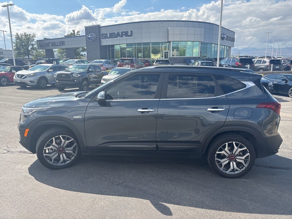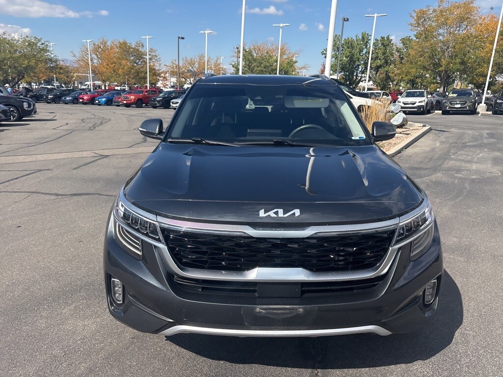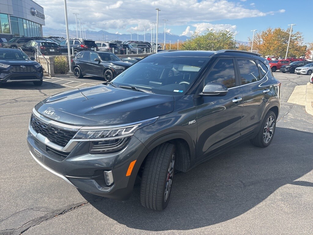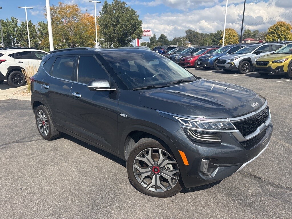 This 2023 Gravity Gray Kia Seltos SX AWD is well equipped and includes these features and benefits: 4-Wheel Disc Brakes, 4.643 Axle Ratio, 8 Speakers, ABS brakes, Air Conditioning, Alloy wheels, AM/FM radio: SiriusXM, Apple CarPlay & Android Auto, Auto High-beam Headlights, Auto-dimming Rear-View mirror, Automatic temperature control, Brake assist, Bumpers: body-color, Carpet Floor Mats, Delay-off headlights, Driver door bin, Driver vanity mirror, Dual front impact airbags, Dual front side impact airbags, Electronic Stability Control, Emergency communication system: 911 Connect, Exterior Parking Camera Rear, Four wheel independent suspension, Front anti-roll bar, Front Bucket Seats, Front Center Armrest, Front fog lights, Front reading lights, Fully automatic headlights, Heated door mirrors, Heated Front Bucket Seats, Heated front seats, Illuminated entry, Leather Shift Knob, Low tire pressure warning, Navigation System, Occupant sensing airbag, Outside temperature display, Overhead airbag, Overhead console, Panic alarm, Passenger door bin, Passenger vanity mirror, Power door mirrors, Power driver seat, Power steering, Power windows, Radio: AM/FM/MP3 Display Audio w/Navigation, Rear seat center armrest, Rear window defroster, Rear window wiper, Remote keyless entry, Security system, Sofino Premium Leatherette Seat Trim, Speed control, Speed-sensing steering, Split folding rear seat, Spoiler, Sport steering wheel, Steering wheel mounted audio controls, Tachometer, Telescoping steering wheel, Tilt steering wheel, Traction control, Trip computer, Turn signal indicator mirrors, Variably intermittent wipers, and Wheels: 18" Alloy w/Machined Finish.