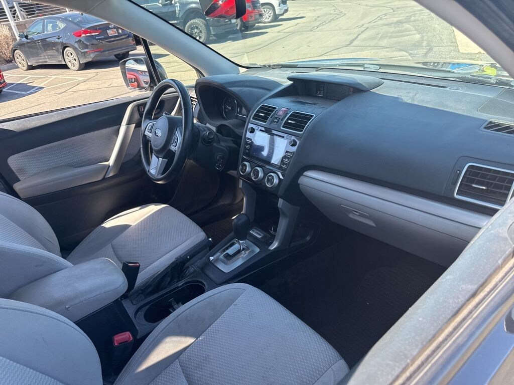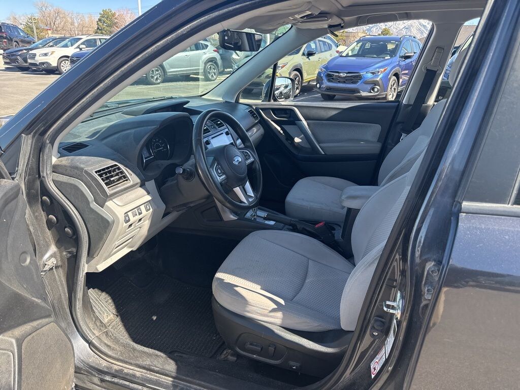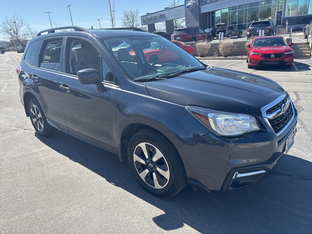 This 2017 Dark Gray Metallic Subaru Forester 2.5i Premium AWD is well equipped and includes these features and benefits: All-Weather Pkg & EyeSight & Blind Spot Detection (Blind Spot Detection w/Rear Cross Traffic Alert, EyeSight System, Heated Exterior Mirrors, Heated Front Seats, High Grade Instrument Cluster w/Color LCD Display, Steering Responsive Fog Lights (SRF), and Windshield Wiper De-Icer), Protection Package #1 (All-Weather Floor Mats, Cargo Cover - Manual Rear Gate, Rear Bumper Cover, Rear Seatback Protector, and Splash Guards), 17" Alloy Wheels, 3.70 Axle Ratio, 4-Wheel Disc Brakes, 6 Speakers, ABS brakes, Air Conditioning, Alloy wheels, AM/FM radio: SiriusXM, Auto-Dimming Mirror w/Compass, Automatic temperature control, Blind Spot Detection, Brake assist, Bumpers: body-color, CD player, Cloth Upholstery, Driver door bin, Driver vanity mirror, Driver's Side Mirror, Dual front impact airbags, Dual front side impact airbags, Electronic Stability Control, Emergency communication system: STARLINK, Exterior Auto-Dimming Mirror w/Approach Light, Exterior Mirror Hardware Kit, Exterior Parking Camera Rear, Four wheel independent suspension, Front anti-roll bar, Front Bucket Seats, Front Center Armrest, Front reading lights, Illuminated entry, Int & Ext Auto Dim Mirror w/Approach Light & BSD, Knee airbag, Low tire pressure warning, Occupant sensing airbag, Outside temperature display, Overhead airbag, Overhead console, Panic alarm, Passenger door bin, Passenger vanity mirror, Passenger's Side Mirror, Power door mirrors, Power driver seat, Power moonroof, Power steering, Power windows, Radio data system, Radio: Subaru Starlink 7.0" Multimedia Plus System, Rear anti-roll bar, Rear seat center armrest, Rear window defroster, Rear window wiper, Remote keyless entry, Roof rack: rails only, Security system, Speed control, Split folding rear seat, Spoiler, Steering wheel mounted audio controls, Tachometer, Telescoping steering wheel, Tilt steering wheel, Traction control, Trip computer, and Variably intermittent wipers.