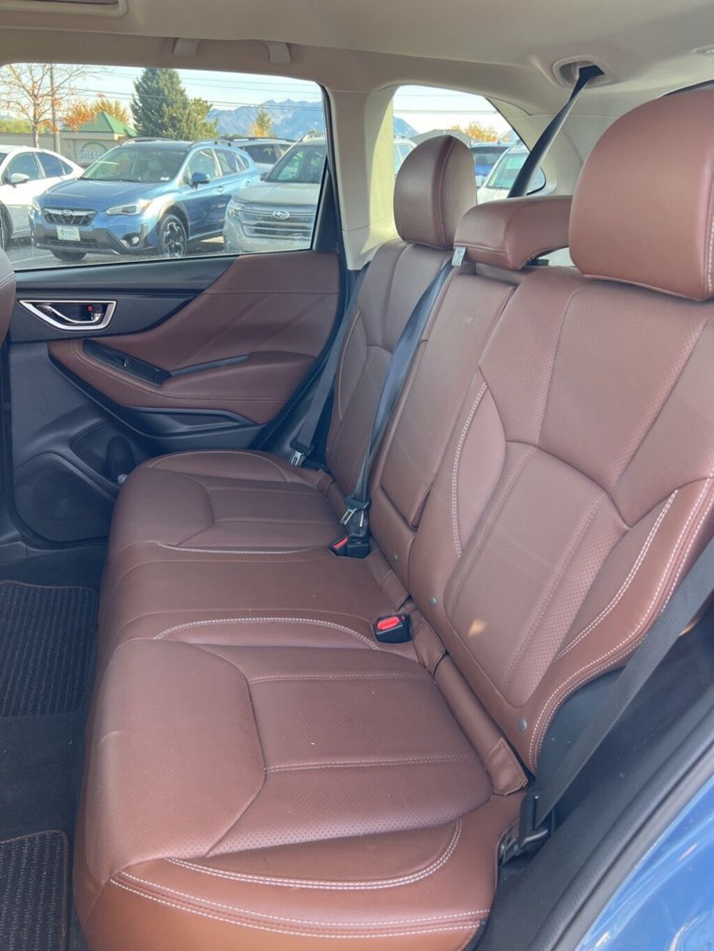This 2021 Blue Subaru Forester Touring AWD is well equipped and includes these features and benefits: 3.70 Axle Ratio, 4-Wheel Disc Brakes, 9 Speakers, ABS brakes, Air Conditioning, Alloy wheels, AM/FM radio: SiriusXM, Auto High-beam Headlights, Automatic temperature control, Brake assist, Bumpers: body-color, CD player, Driver door bin, Driver vanity mirror, Dual front impact airbags, Dual front side impact airbags, Electronic Stability Control, Emergency communication system: STARLINK Safety and Security (Subscription Required), Exterior Parking Camera Rear, Four wheel independent suspension, Front anti-roll bar, Front Bucket Seats, Front Center Armrest, Front dual zone A/C, Front fog lights, Front reading lights, Fully automatic headlights, harman kardon 576W Amp & Speaker System, harman/kardon® Speakers, Heated door mirrors, Heated Front Bucket Seats, Heated front seats, Heated rear seats, Heated steering wheel, HVAC memory, Illuminated entry, Knee airbag, Leather Shift Knob, Low tire pressure warning, Memory seat, Navigation System, Occupant sensing airbag, Outside temperature display, Overhead airbag, Overhead console, Paddle-Shift Control Switches, Panic alarm, Passenger door bin, Passenger vanity mirror, Perforated Leather-Trimmed Upholstery, Power door mirrors, Power driver seat, Power Liftgate, Power moonroof: Panoramic, Power passenger seat, Power steering, Power windows, Premium audio system: harman/kardon, Radio data system, Radio: Subaru Starlink 8.0" Multimedia Nav System, Rear anti-roll bar, Rear seat center armrest, Rear window defroster, Rear window wiper, Remote keyless entry, Roof rack: rails only, Security system, Speed control, Speed-sensing steering, Split folding rear seat, Spoiler, STARLINK/Apple CarPlay/Android Auto, Steering wheel mounted audio controls, Tachometer, Telescoping steering wheel, Tilt steering wheel, Traction control, Trip computer, Turn signal indicator mirrors, Variably intermittent wipers, and Wheels: 18" x 7.0J Blk Machine Touring Alum Alloy.