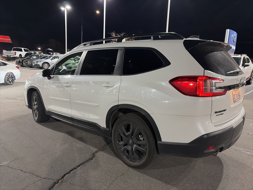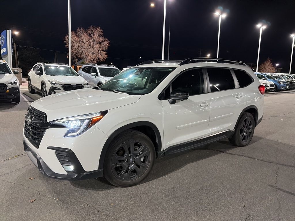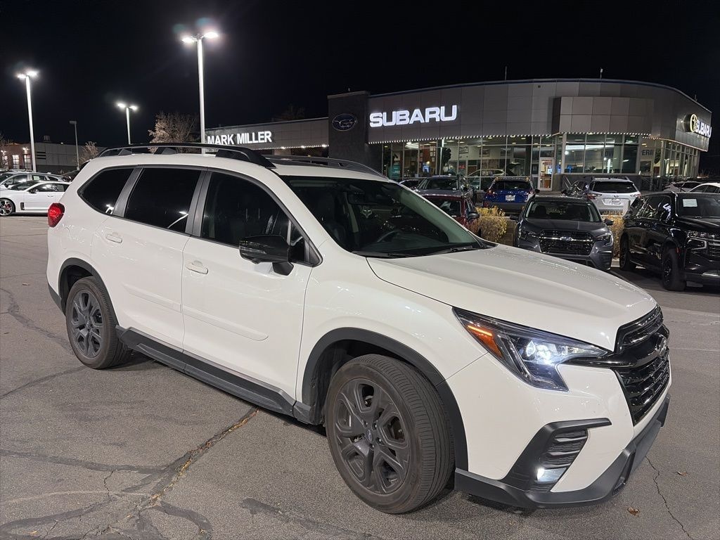 This 2023 Crystal White Pearl Subaru Ascent Onyx Edition AWD is well equipped and includes these features and benefits: 14 Speakers, 3rd row seats: bench, 4-Wheel Disc Brakes, ABS brakes, Air Conditioning, Alloy wheels, AM/FM radio: SiriusXM, Auto High-beam Headlights, Auto-dimming Rear-View mirror, Automatic temperature control, Axle Ratio: 4.44, Brake assist, Bumpers: body-color, Compass, Delay-off headlights, Driver door bin, Driver vanity mirror, Dual front impact airbags, Dual front side impact airbags, Electronic Stability Control, Emergency communication system: STARLINK Safety and Security (Subscription Required), Four wheel independent suspension, Front anti-roll bar, Front Bucket Seats, Front Center Armrest, Front dual zone A/C, Front fog lights, Front reading lights, Fully automatic headlights, Garage door transmitter: HomeLink, harman/kardon® Speakers, Heated door mirrors, Heated Front Bucket Seats, Heated front seats, Heated rear seats, Heated steering wheel, HVAC memory, Illuminated entry, Knee airbag, Leather Shift Knob, Leather steering wheel, Low tire pressure warning, Memory seat, Navigation System, Occupant sensing airbag, Outside temperature display, Overhead airbag, Overhead console, Panic alarm, Passenger door bin, Passenger vanity mirror, Power door mirrors, Power driver seat, Power Liftgate, Power moonroof, Power passenger seat, Power steering, Power windows, Radio data system, Radio: Subaru STARLINK 11.6" Multimedia Nav System, Rear air conditioning, Rear anti-roll bar, Rear reading lights, Rear window defroster, Rear window wiper, Reclining 3rd row seat, Remote keyless entry, Security system, Speed control, Speed-sensing steering, Split folding rear seat, Spoiler, STARLINK/Apple CarPlay/Android Auto, StarTex Upholstery, Steering wheel mounted audio controls, Tachometer, Telescoping steering wheel, Tilt steering wheel, Traction control, Trip computer, Turn signal indicator mirrors, Variably intermittent wipers, and Wheels: 20" x 7.5 J Aluminum Alloy w/Black Finish.