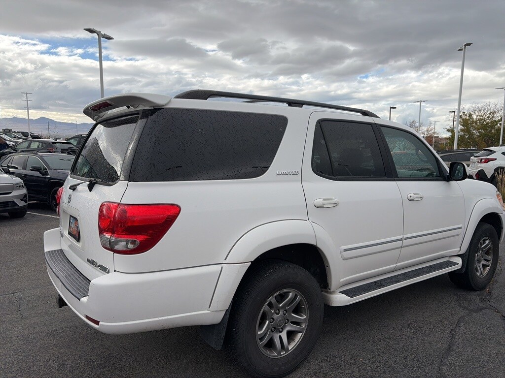 This 2006 White Toyota Sequoia Limited 4WD is well equipped and includes these features and benefits: 5-Speed Automatic with Overdrive, 4WD, 10 Speakers, 17 x 7.5JJ Aluminum Disc Wheels, 3rd row seats: split-bench, 4-Wheel Disc Brakes, 4.10 Axle Ratio, ABS brakes, Air Conditioning, Alloy wheels, AM/FM radio, Auto-dimming Rear-View mirror, Automatic temperature control, Bodyside moldings, Brake assist, Bumpers: body-color, Cassette, CD player, Compass, Driver door bin, Driver vanity mirror, Driver's Seat Mounted Armrest, Dual front impact airbags, Electronic Stability Control, Front anti-roll bar, Front Bucket Seats, Front Center Armrest w/Storage, Front dual zone A/C, Front fog lights, Front Heated Captain Seats, Front reading lights, Front wheel independent suspension, Fully automatic headlights, Garage door transmitter: Homelink, Heated door mirrors, Heated front seats, Illuminated entry, JBL 3-in-1 Premium Combo, Leather Seat Trim, Leather steering wheel, Low tire pressure warning, Occupant sensing airbag, Outside temperature display, Overhead console, Panic alarm, Passenger door bin, Passenger seat mounted armrest, Passenger vanity mirror, Power door mirrors, Power driver seat, Power moonroof, Power passenger seat, Power steering, Power windows, Radio data system, Rear air conditioning, Rear anti-roll bar, Rear reading lights, Rear seat center armrest, Rear window defroster, Rear window wiper, Reclining 3rd row seat, Remote keyless entry, Roof rack, Security system, Speed control, Speed-sensing steering, Split folding rear seat, Steering wheel mounted audio controls, Tachometer, Tilt steering wheel, Traction control, Trip computer, Variably intermittent wipers, and Voltmeter.